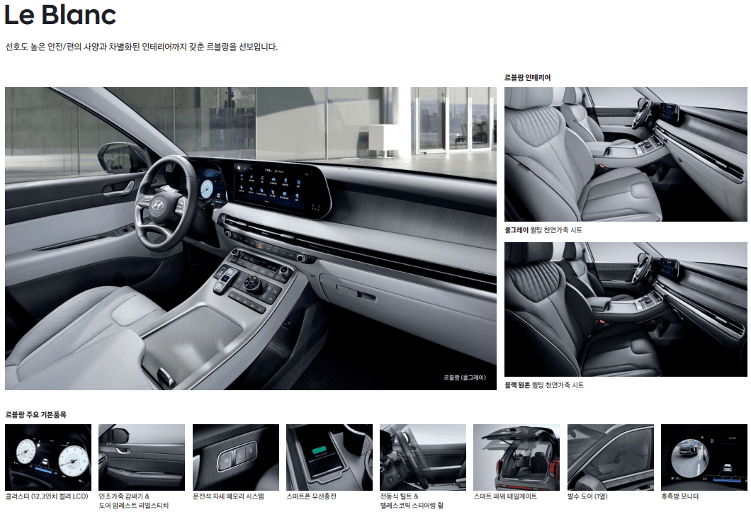 2. 선호도 높은 안전/편의 사양과 차별화된 인테리어까지 갖춘 르블랑을 선보입니다.