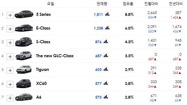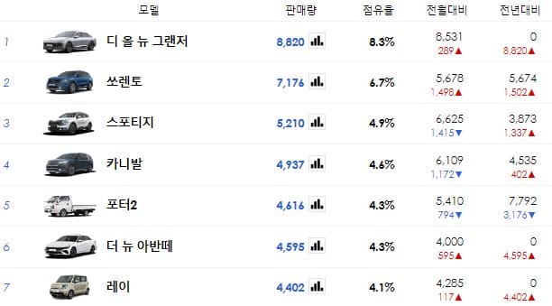 23년 8월 국산모델( 디올뉴 그랜저/쏘렌토/스포티지/카니발/포터2/더뉴아반떼/레이) 해외 모델( BMW 5/ E class/ S class / The new GLC-class / Tiguan/ XC60 / A6) BEST 7 판매 순위 / 브랜드별 BEST 5 알아보기
